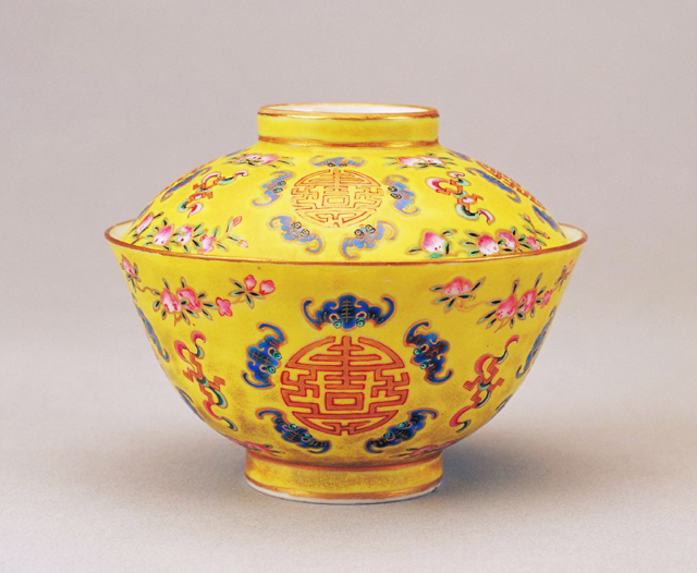 清同治黃地粉彩五蝠捧壽字蓋碗(圖片來(lái)源于故宮博物院官網(wǎng))