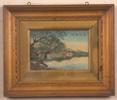 此件著色黑白像景織物以“九溪十八澗”的照片為藍本,通過陰影組織來表達景物的層次、遠近、陰面和陽面,還根據(jù)景物的要求上色,使其在絲綢上得到了真實再現(xiàn)。此件像錦織造細膩,在右上側(cè)從右到左織有“九溪十八澗”等字樣,并配有原框。
