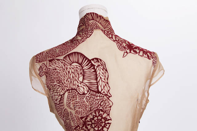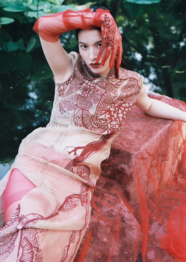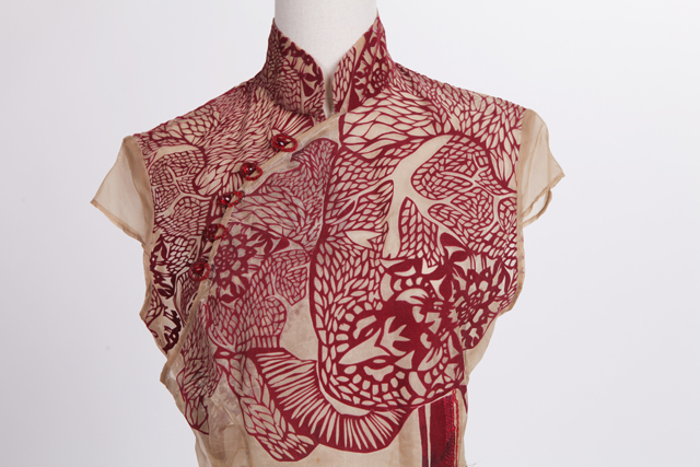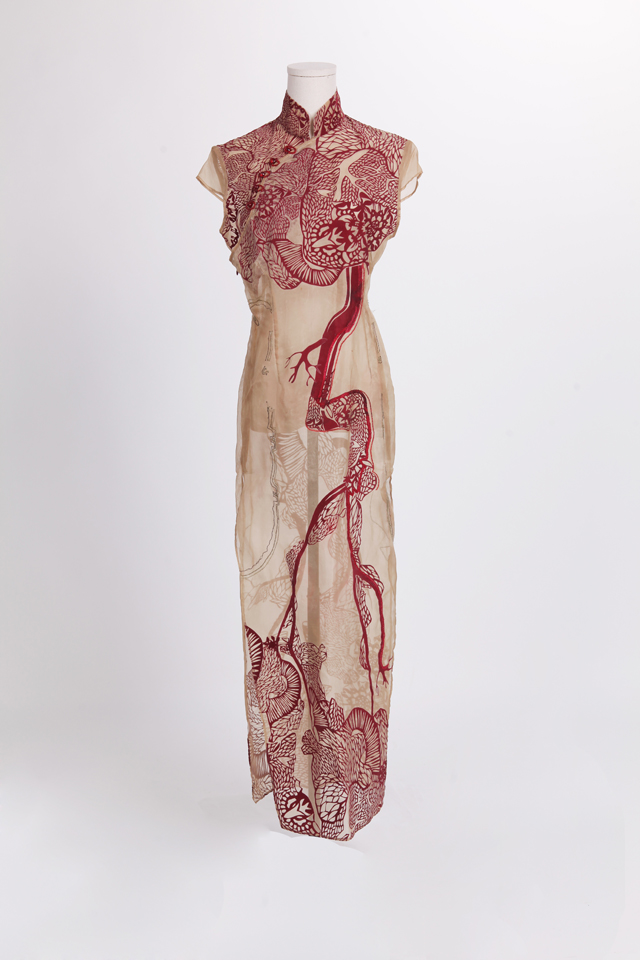 刻畫心臟紋樣所用的紙雕藝術(shù),是千年來(lái)中國(guó)的傳統(tǒng)藝術(shù)之一,小到隨意貼在玻璃上的窗花,大到女兒出嫁的“花本子”,都有紙雕的蹤影。同時(shí)心臟紋路印花的放大和其中抽象性的藝術(shù)表達(dá)則是取自于當(dāng)代藝術(shù)的精華。二者巧妙結(jié)合,帶來(lái)傳統(tǒng)文化與當(dāng)代藝術(shù)之間的碰撞,為旗袍整體風(fēng)格帶來(lái)別樣韻味。