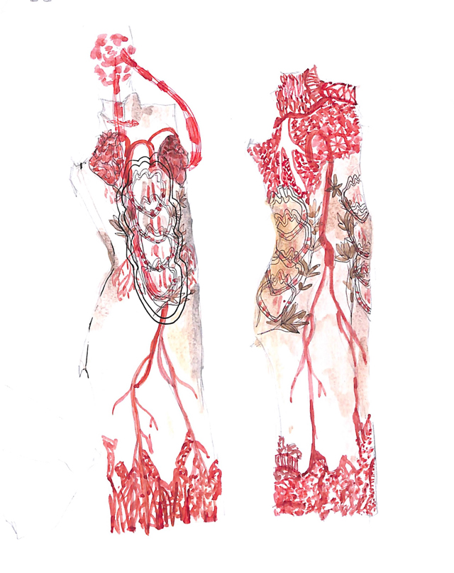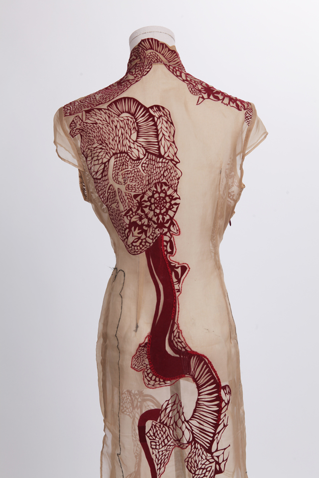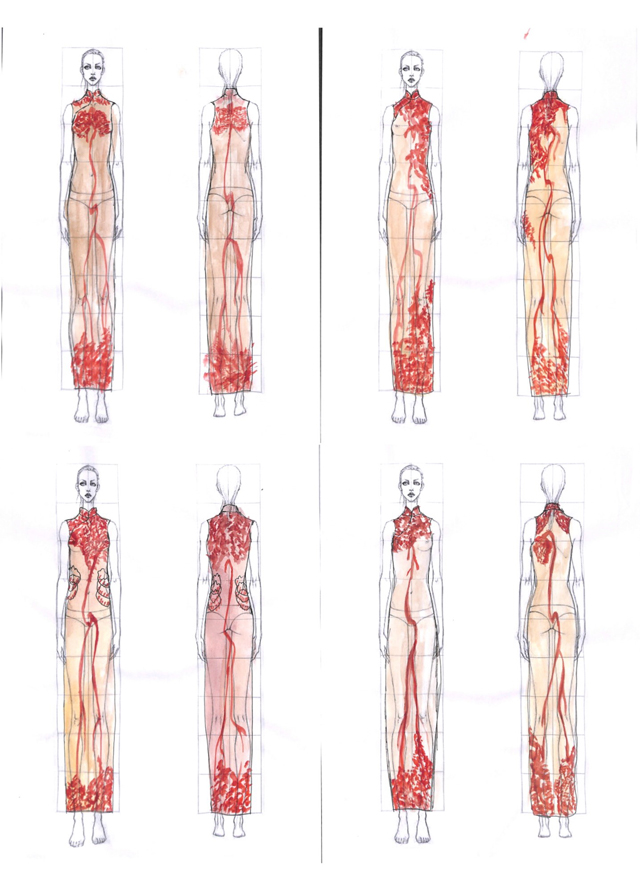 紅線自古以來(lái)象征著人和人之間的維系,在愛情中是緣分的牽引,在親情里是血脈的相連。旗袍中大小不一的血管紋樣從心臟出發(fā),向身體周邊延伸,血管周圍處有紅線以鎖繡和埋金繡法鐫刻其中,一方面強(qiáng)調(diào)邊緣,一方面代表著親情的關(guān)心,情感的聯(lián)結(jié)??嚯y無(wú)情,愛卻能化為守護(hù)生命的能量,為至親至愛的人提供勇氣和力量。