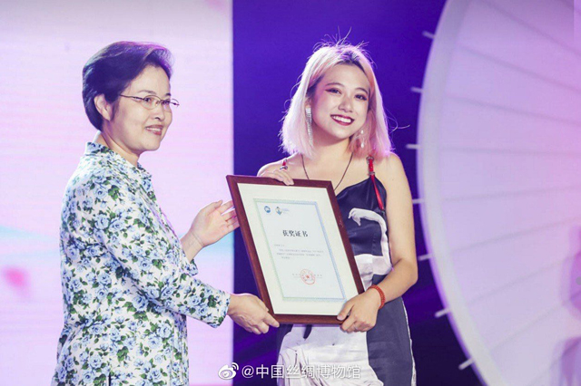 (“苦難花綻”旗袍榮獲2019年杭州旗袍稱號(hào),設(shè)計(jì)師劉林溪在旗袍之夜上臺(tái)領(lǐng)獎(jiǎng))