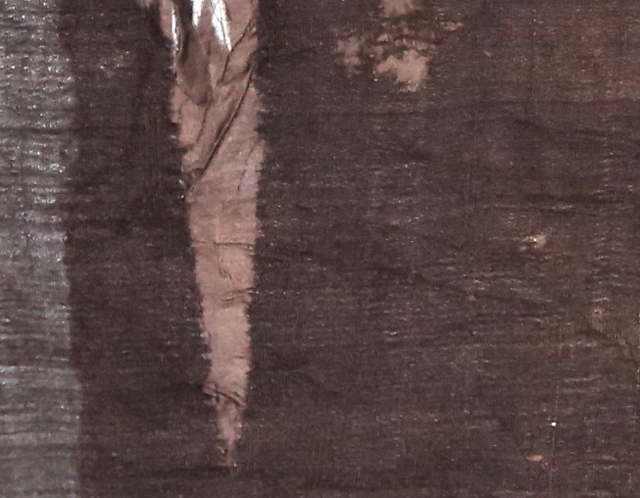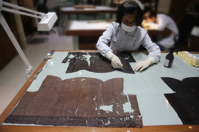 首先清潔織物表面污染物。用紡織品文物專用吸塵器小心吸除表面灰塵,借助光滑的薄竹簽輕輕刮除固體結(jié)晶,再以棉簽蘸取酒精溶液擦拭污染部位。