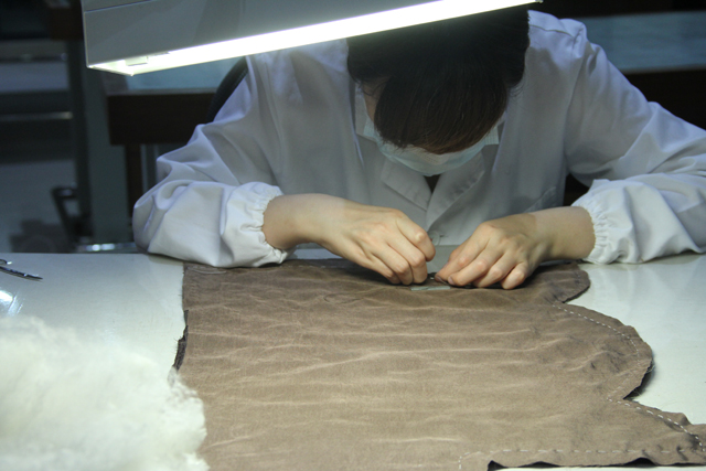 先將面料與襯里拆縫開,而后分別對(duì)兩層面料和一層襯里加固修復(fù)。破碎的舊絲綿移出另行保存,換之以新絲綿填充進(jìn)修復(fù)完成的面料與襯里之間,再按原有縫制方法將羅帽拼合。