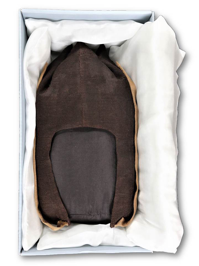因羅帽屬立體類紡織品,修復(fù)完成后,按羅帽的立體形制,制作具有緩沖作用的支撐模具,便于陳列展示。同時(shí)制作無酸包裝紙盒及盒內(nèi)緩沖材料,以便運(yùn)輸(圖13-14)。