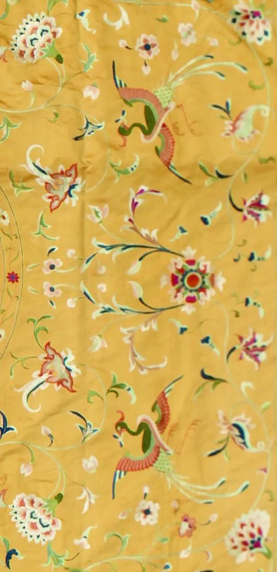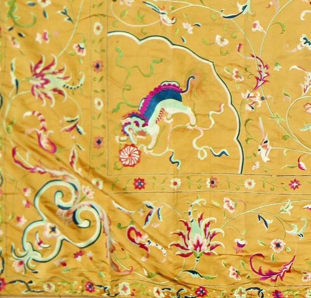 整件繡品具有廣繡特點(diǎn),花紋細(xì)密,針?lè)?xì)膩,層次分明,配色雅致,在明黃色的底色配以淺綠、淺藍(lán)、粉紅、白色等清新雅致的色調(diào),使得繡品濃淡相宜。該床罩裝飾紋樣精美,既有獅子滾繡球、仙鶴銜瑞枝等中國(guó)傳統(tǒng)審美情趣紋樣,又有花束、藤蔓、卷葉等體現(xiàn)華麗柔美的歐洲洛可可式裝飾圖案,呈現(xiàn)出18世紀(jì)海上絲綢之路背景下中西藝術(shù)的交流和互鑒,同時(shí)又承載了一個(gè)家族的輝煌歷史,成為歐洲皇室、貴族世代相傳的珍品。