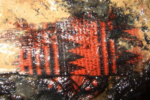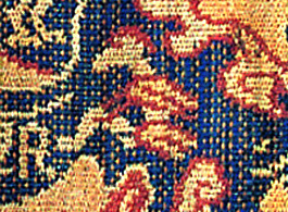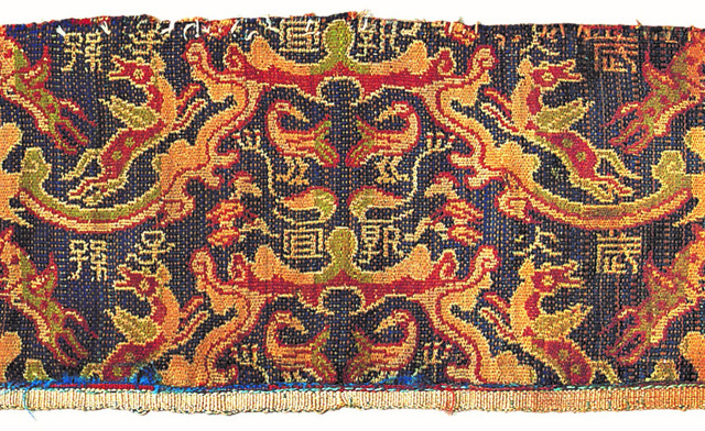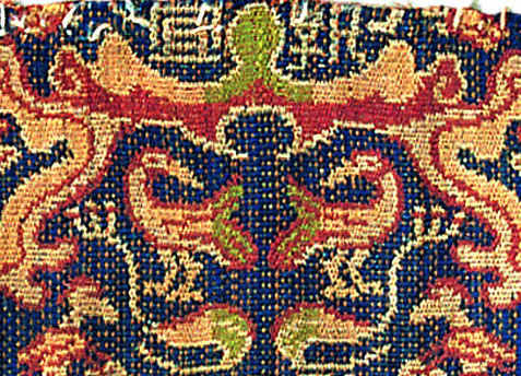 現(xiàn)存最早的織錦實(shí)物出土于遼寧朝陽(yáng)西周墓地,南方江西靖安東周墓中也出土了十分完好的織錦。早期的織錦多是以經(jīng)線顯花、采用1/1平紋經(jīng)重組織織造的平紋經(jīng)錦,其興盛期在戰(zhàn)國(guó)秦漢時(shí)期,并一直持續(xù)到唐初。這件“恩澤”錦采用的就是這種組織,它以深藍(lán)色經(jīng)線作地,局部織入橙色經(jīng)線以產(chǎn)生雨絲效果,紅、綠、黃、白四色經(jīng)線顯花,其中黃和綠相互交替在不同區(qū)域中顯花。