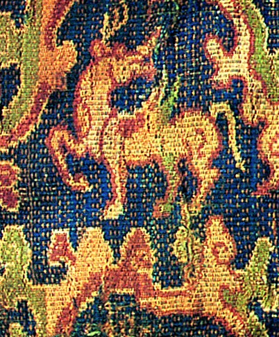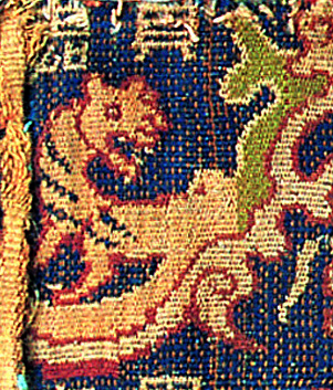 同時(shí),這件織錦的圖案也十分具有時(shí)代特色,雖然它是由五塊相同的織錦殘片拼縫而成,但仍可清晰地看到它采用了云氣紋作為骨架,其云氣連續(xù)無(wú)間斷,在有些地方還表現(xiàn)出巖石的象形,因而也有人稱(chēng)其為“山狀云”,其圖案也以左右對(duì)稱(chēng),從內(nèi)到外分布的神獸為:瑞鳥(niǎo)、羽人、兩只身帶豹斑的辟邪、神鹿和猛虎。