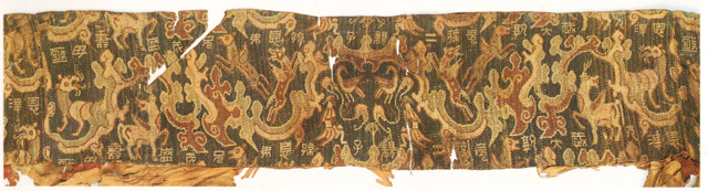 這類(lèi)圖案在漢晉時(shí)期十分流行,并在西北地區(qū)大量出土,它們有一個(gè)共同的名字——云氣動(dòng)物紋錦,與漢代流行的博山爐及西漢金銀錯(cuò)銅車(chē)飾相比較,可知這些云氣動(dòng)物錦描繪的其實(shí)是仙山仙境,而在其中織入祈壽類(lèi)的吉祥銘文,更是充分表達(dá)當(dāng)時(shí)人們對(duì)長(zhǎng)生的渴望并蔭及子孫的觀念。