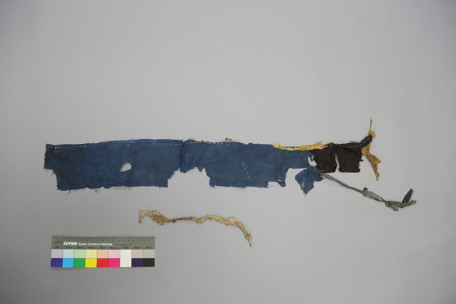 本案例中的百衲修復(fù)前共有大小5塊,分別為百衲主體、藍(lán)色條帶、長方形錦、三角形錦及細(xì)長絲絮一條(圖2),屬同一洞窟出土文物。據(jù)窟內(nèi)出土遺物分析,石窟時代不應(yīng)晚于唐代,其開鑿時代可能為隋末唐初。從織物品種及類別看,該洞窟出土的百衲極有可能為北朝晚期至隋所制作。