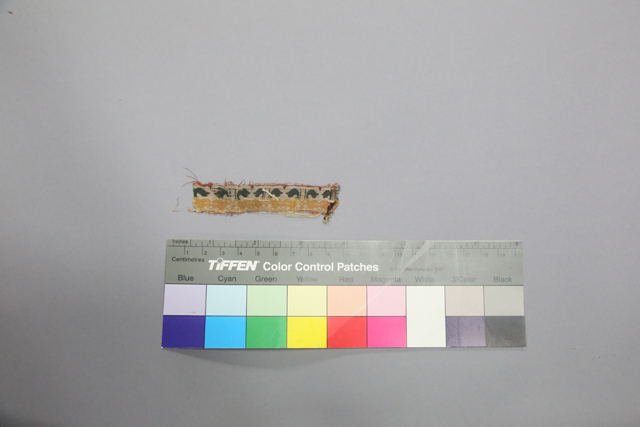 梳理文物的經(jīng)緯向紗線可以看到百衲主體有兩處明顯的拐角(圖9),相鄰兩塊織物呈直角拼接,且長短不一,因此可推斷出文物主體為長方形;又因在兩個轉(zhuǎn)角處有保存較好的三角形錦(由正方形錦在中間折疊后縫合、裁剪形成),且另有單獨(dú)、類似的一片三角形錦(圖10),從其制作方法及相鄰織物的種類來判斷,與一般所見百衲形制不同,排除平面文物的可能,應(yīng)為長方體或是表面長方形,下有垂掛的形式。