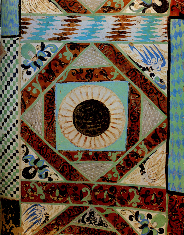 從各部分殘剩的痕跡來看,該百衲內(nèi)部的單元拼縫規(guī)律和莫高窟251窟、431窟等窟的平棊頂上的圖案類似(圖7),這一特征可作為確定其形制的參考,基本可確定該百衲由兩塊褐色綺、一塊正方形錦及一塊大正方形形成一組循環(huán)(圖8)。