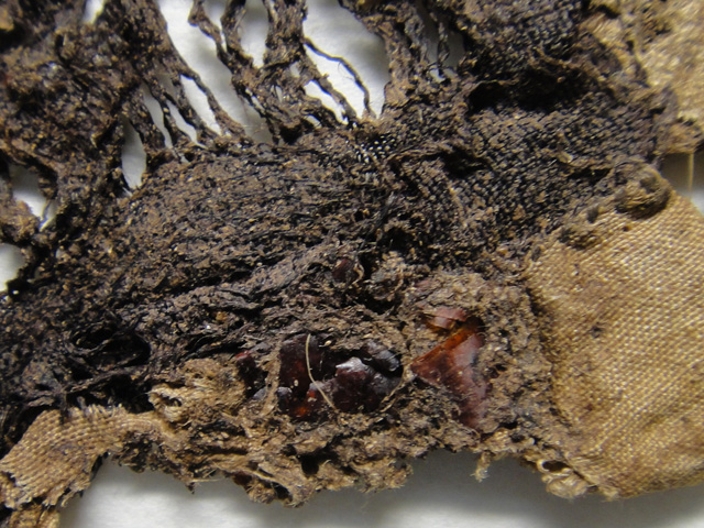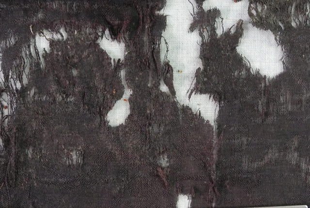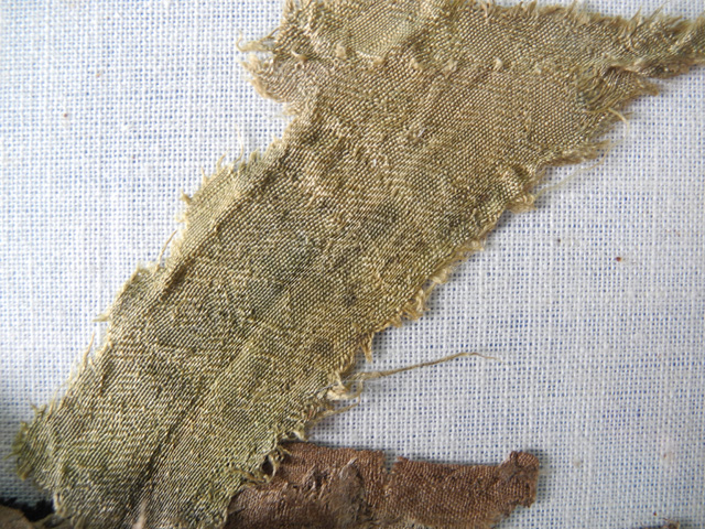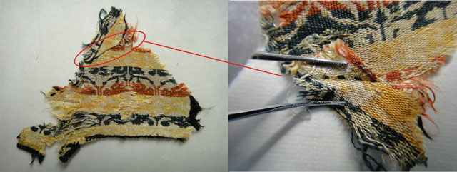 一是在現(xiàn)有殘存的、面積稍大的文物下加入襯布,用鋪針法修復(fù)固定(圖20);