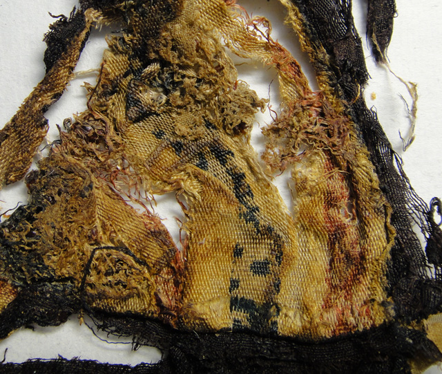 文物已出現(xiàn)嚴(yán)重病害,除大面積殘缺以外,還有嚴(yán)重的破裂、污染、糟朽、皺褶、褪色和微生物損害等病害(圖13-圖18)。