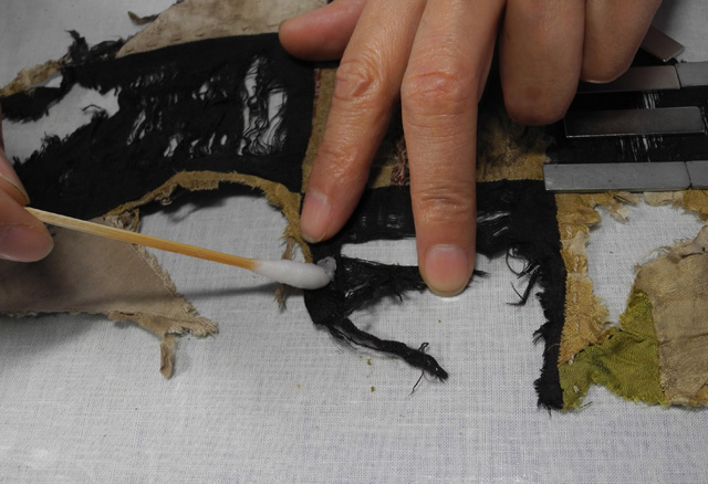 在修復(fù)前進(jìn)行取樣分析,并實(shí)施消毒、清洗等措施,利用棉簽蘸取無水乙醇在污染處滾動去污,使大部分的污染物被清潔干凈(圖19)。之后平整織物,使其經(jīng)平緯直,基本恢復(fù)到最初的狀態(tài)。