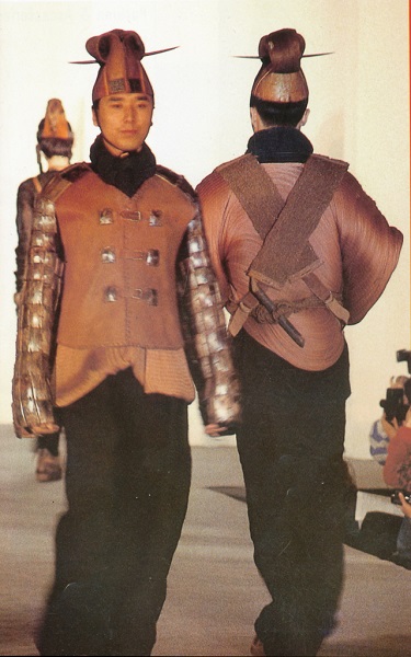 作品《秦俑》是由著名設計師馬可創(chuàng)作設計,并參加了1994年第二屆“兄弟杯”中國國際青年服裝設計師作品大賽。服裝圈的朋友們可能對“兄弟杯”有所了解,“兄弟杯”大賽屬于創(chuàng)意類的服裝設計大賽,特別強調表現設計師的自我意識,設計可以不受生活裝的束縛,在創(chuàng)意的宇宙中自由飛翔,大賽要求設計作品要有鮮明個性風格和時代感,并融于本民族的優(yōu)秀文化之中,同時要求系列服裝設計完整統(tǒng)一,富有美感,服裝服飾配套有新意。