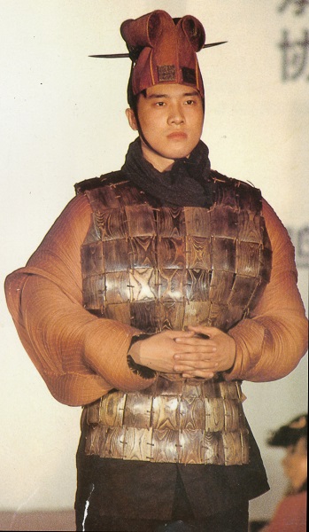 1994年的青年設計師馬可剛年滿23歲,從蘇州絲綢工學院工藝美術系畢業(yè)兩年,在廣州市港臺工貿公司服裝設計事業(yè)部擔任設計師工作,應大賽弘揚中國傳統(tǒng)文化要求,確定了以秦俑形象進行創(chuàng)作設計。內衣采用連云山山民手織的土夏布,經民間傳統(tǒng)工藝染色,加之清泉漂洗和午曬晚晾,從而變得古色古香;盔甲是采用深山的老梓樹木,鋸刨成長條寸方薄塊,經山溪淤泥浸泡成古銅色,再用沸沙細磨光亮;頭盔采用細嫩棕毛,經秋霜凌凍成黃紅色;手鐲經巧匠精雕細刻,粗獷碩大又玲瓏碧玉;當《秦俑》模特隨著韻律走動時,胸前的串珠則會晃動,發(fā)出鏗鏘的金珠玉盤之聲。
