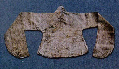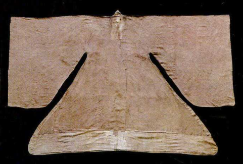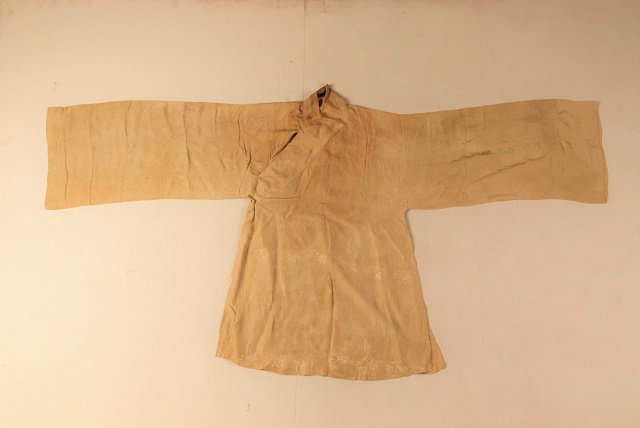 黃綺折枝花卉女單衣和曲水如意云羅裙正是出土于此批絲綢衣物之中。單衣長96cm,無襯里,通袖長196cm,胸圍50cm,袖口37.5cm,下擺寬69cm,款式為交領(lǐng)、右衽、斜襟,兩袖平直,袖口寬大,并綴有袖緣,衣身左右兩側(cè)開衩,外襟有以同料織物制成的紐扣,與右腋下處的紐襻相扣固結(jié)。單衣面料織物為平紋地上起四枚斜紋花的綺織物。暗花圖案為橫向排列的折枝花卉,每排之間的折枝花卉間隔29.5cm。