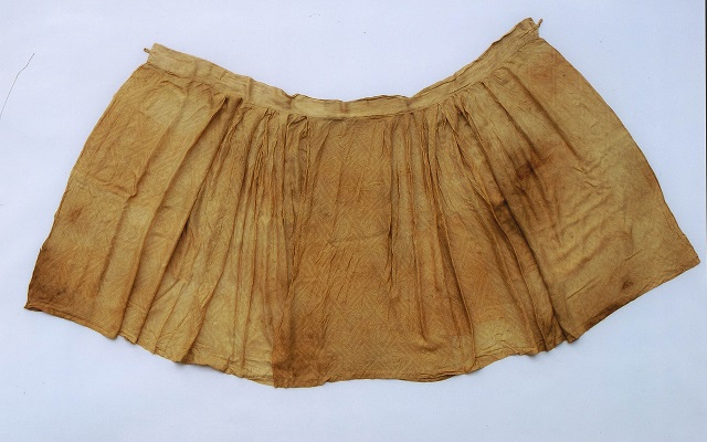 裙為百褶裙,裙長80cm,裙腰高60cm,裙分為兩片,每片均由三幅半織物拼縫而成,由左右兩片在前中部錯壓重疊而呈馬面,右片在前,左片在后,腰部兩側(cè)打有細(xì)褶,每褶寬約3cm。裙腰兩端各釘有一紐襻,以用于圍系左、右裙片。馬面裙料為有固定絞組織的二經(jīng)絞花羅,地組織為1:1絞紗,花部組織為1:1平紋。曲水如意云紋,以滿地的曲水幾何紋為骨架,內(nèi)填如意云紋,寓意綿長不斷,為明代常見的吉祥圖案。這種輕薄涼爽的羅裙是南方女子常穿的夏日下裝。