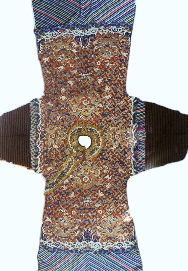 它的式樣為圓領(lǐng)、右衽、大襟、上下相連直身,下幅四開(kāi)裾,窄袖籠,但缺失了馬蹄袖。裝飾紋樣為:前胸、后背正龍二,兩肩正龍二,前后襟行龍四,底襟行龍一,領(lǐng)前后小正龍二,左右及交襟處小行龍四,缺少袖端小行龍二(因?yàn)槿鄙亳R蹄袖)。共飾有龍紋十六條,其中大型金龍九條為主體紋飾。