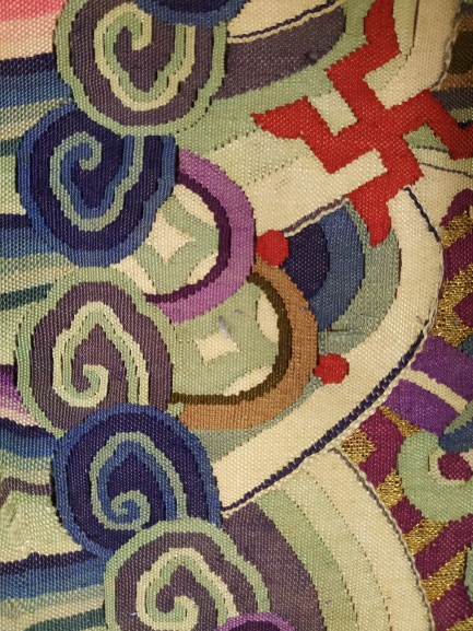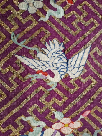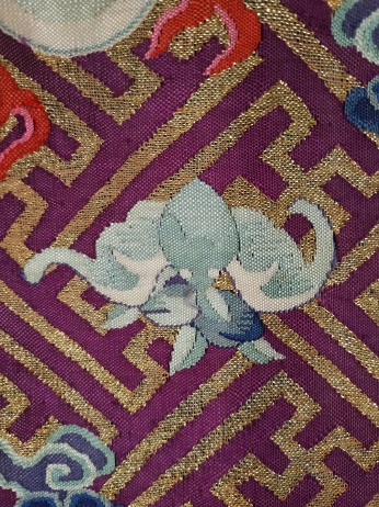 中國(guó)絲綢博物館的絲路館三樓曾展示過(guò)一件清代紫地緙絲龍袍,形制完整,壽紋間成對(duì)飛翔的仙鶴極為出色,所用金線品質(zhì)極佳。然而,此龍袍在修復(fù)前卻僅是一塊有多處破裂的袍料。