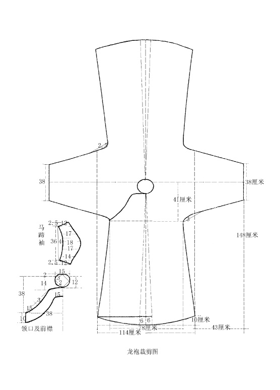 測(cè)量袍料各部位尺寸,并通過(guò)實(shí)物與史料相結(jié)合,確定缺損部位的形制尺寸,最終繪制裁剪圖(圖3)。