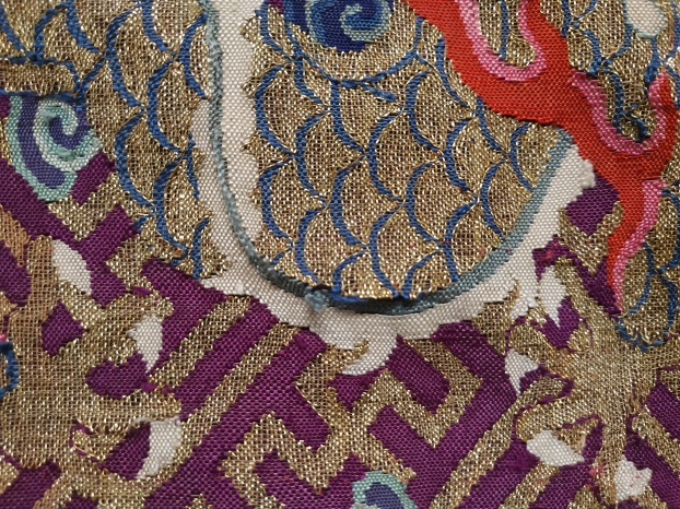 緙絲織物有其獨(dú)特的工藝,也正因此而導(dǎo)致了緙絲文物容易出現(xiàn)大范圍的局部破損。本件龍袍在修復(fù)時(shí),充分考慮了緙絲的特點(diǎn),以襯墊的織物為加固基礎(chǔ),以輔助經(jīng)線為橋梁,以類(lèi)似織補(bǔ)的方式編入緯線作為補(bǔ)缺,從而既給予了緙絲織物以牢度上的加強(qiáng),又彌補(bǔ)了外觀的缺撼。