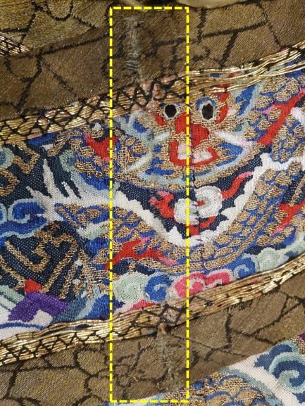 因此,在修復(fù)時(shí),只能在破損處借助背襯添加輔助經(jīng)線,然后在輔助經(jīng)線的基礎(chǔ)上,采用平紋編織的方法將緯線引入。修復(fù)完畢的“破洞”,看上去的效果與刺繡中的“貼金繡”比較類(lèi)似。同時(shí),將斷開(kāi)的領(lǐng)緣部分仔細(xì)拼合(圖8)。