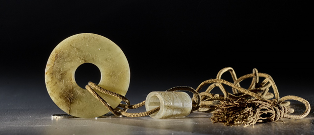 其中一件玉璧,刻有“大唐皇帝昪謹于東都內庭修金籙道場,設醮謝土,上仰玄澤,修齋事畢,謹以金龍玉璧投詣西山洞府。昇元四年(940)十月日告聞”字樣,知為南唐開國皇帝烈祖李昪的投龍玉璧,傳世近三百年后,作為古物玩好,為趙伯澐收藏,尤為難得。