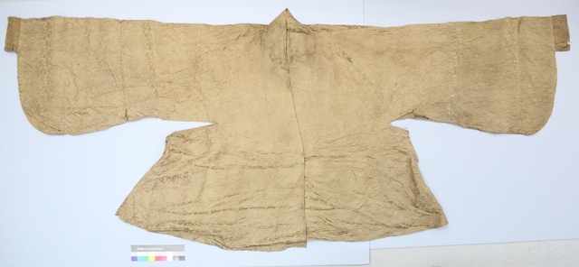 此襖出于合葬墓的東室,即錢樟夫人華氏墓中。從出土的兩方墓志可知,錢氏是無錫的一大望族,而華氏為無錫蕩口望族,錢華兩家世代通婚,錢樟為吳越王錢鏐的二十世孫。錢樟夫婦合葬墓保存完整,女性墓主人頭戴發(fā)冠,冠上插有大量金銀發(fā)飾,墓室內(nèi)衣物保存情況較好。男性墓主人衣物保存較差,但該墓內(nèi)隨葬品豐富,木器、錫器、金銀器、銅器、瓷器、絲綢等計(jì)有100余件,其中絲綢種類有被子、夾襖、背包、枕頭、紗巾、繡鞋、緞裙、棉褲等22件(套)。