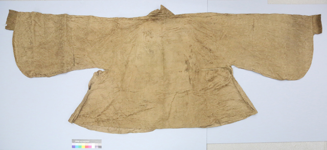 整形。局部修復(fù)加固完成后,再次整理夾襖的形狀,完成修復(fù)(圖12-圖14)。
