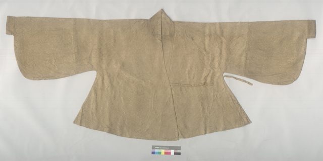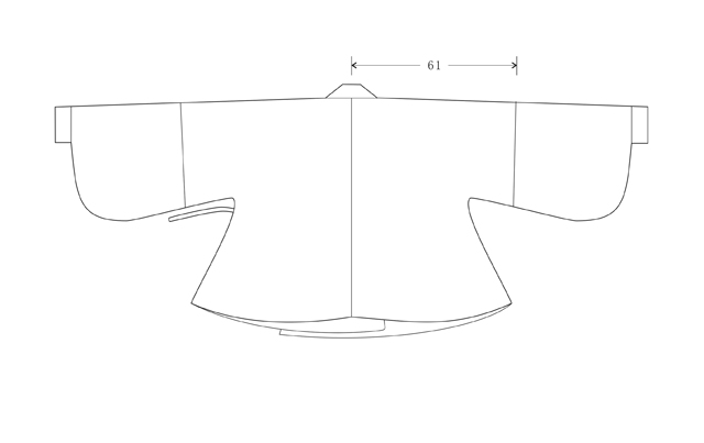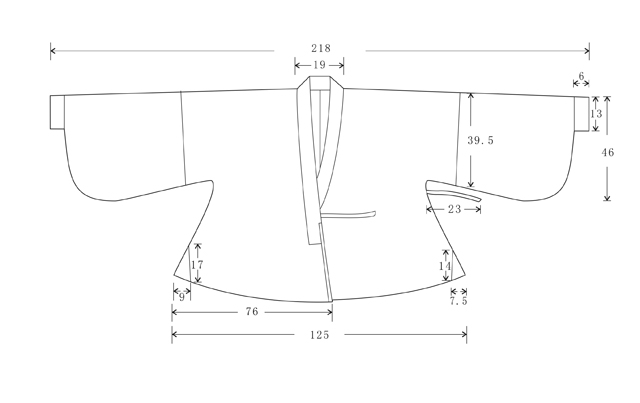 夾襖通袖長218cm,衣長82.5cm。對襟,平鋪時(shí)兩衣襟略有交疊,呈交領(lǐng)狀,左衽,單層無襯里,下擺邊緣內(nèi)鑲絹襯。袖為琵琶狀,袖口窄小,衣長及腰(圖3-圖4)。袖子背面拼縫處作斜省,因而使衣服平攤時(shí)左右兩襟略向內(nèi)收而成交領(lǐng)狀,兩袖端略向下傾斜,而非水平(圖5)。前片下擺左右兩側(cè)均拼縫三角形面料,后片無。