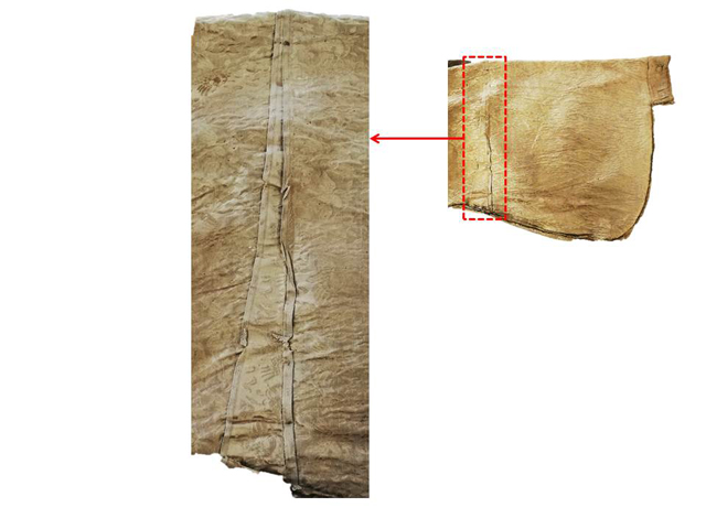 此件緞襖整體保存較為完整,前襟和領(lǐng)口局部有黑色污漬,袖子散布黑色小斑點(diǎn),袖口邊緣有小塊織物缺失,雙腋下有對稱性橫向破裂,雙側(cè)縫線局部脫線,衣袖和下擺部位有褶皺(圖10)。