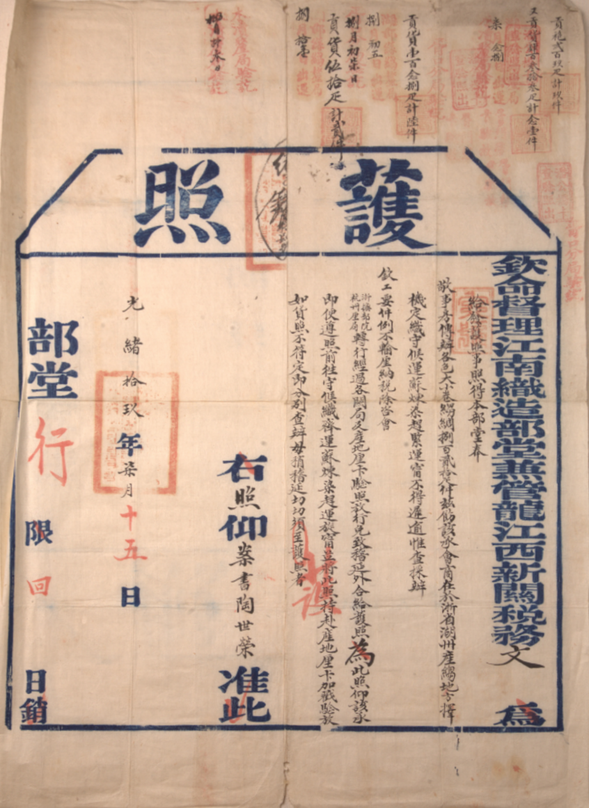 中國社會(huì)進(jìn)入19世紀(jì)之后,商品流通地域隨著生產(chǎn)的發(fā)展得到了進(jìn)一步擴(kuò)大。國家為了防范偷稅、漏稅事件的發(fā)生,或因戰(zhàn)爭之特殊需要,各級(jí)稅務(wù)或軍事機(jī)關(guān)在交通要道或險(xiǎn)隘路口設(shè)立征稅與檢查的關(guān)卡。當(dāng)有關(guān)管征機(jī)關(guān)對(duì)外運(yùn)貨物照章納稅后,發(fā)給的一種允許已稅貨物或免稅貨物在指定地域內(nèi)通行的憑證,通稱為“商品流通準(zhǔn)運(yùn)證”。這種準(zhǔn)運(yùn)證在道光二十五年(1845)后被稱為護(hù)照,中國絲綢博物館收藏了一件清代光緒十九年的護(hù)照,屬于免稅護(hù)照。