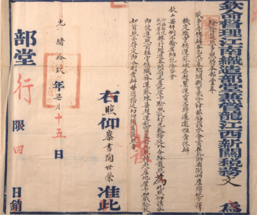 這份護(hù)照記錄了清王朝即使在其覆滅前夕,仍實(shí)行朝廷的典制,依靠“江南織造”獲取大量的宮廷和官府需要的各類絲織品這一歷史事實(shí)。護(hù)照中“敬事房傳辦各色大小縐綢捌百貳拾疋件茲飭該承會(huì)商在於浙省湖州產(chǎn)縐地方擇機(jī)定織”的記錄,表明清代后期織造府已無法獨(dú)立承織朝廷所需的巨量緞匹。許多內(nèi)用緞匹向民間綢莊定織或直接采購,以完成交納任務(wù)。