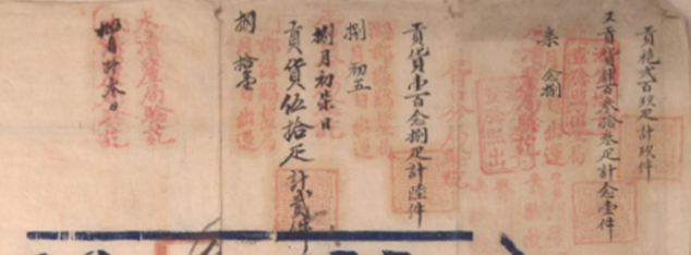 護(hù)照上方還有一組用小楷書寫的驗(yàn)收記文字和紅色印章,記載了這樣的史實(shí):貢袍209疋(pǐ)又貢貨433疋,湖郡絲縐厘局七月二十八日出運(yùn),并有“胥門厘卡驗(yàn)放”、“潘公橋卡查驗(yàn)照出”、“木瀆厘局驗(yàn)訖”等印章;貢貨128疋湖郡絲縐厘局八月初五出運(yùn),有八月初七“胥口分局驗(yàn)訖”(章)。這些厘局、分局、查驗(yàn)關(guān)卡分布在蘇州以南太湖東側(cè)地區(qū),相互之間的距離不足100公里,相當(dāng)密集。“厘金”原是清朝地方官員為募集鎮(zhèn)壓太平軍軍費(fèi)而于咸豐三年(1853)九月開征的一種地方稅收,這一組查驗(yàn)記印,是當(dāng)時(shí)蘇南地區(qū)密集的厘卡和查驗(yàn)的實(shí)錄,可見自咸豐初年實(shí)施的地方籌餉方法,至光緒年間已變?yōu)槿珖缘亩惙N,成為朝廷財(cái)政的重要來源。