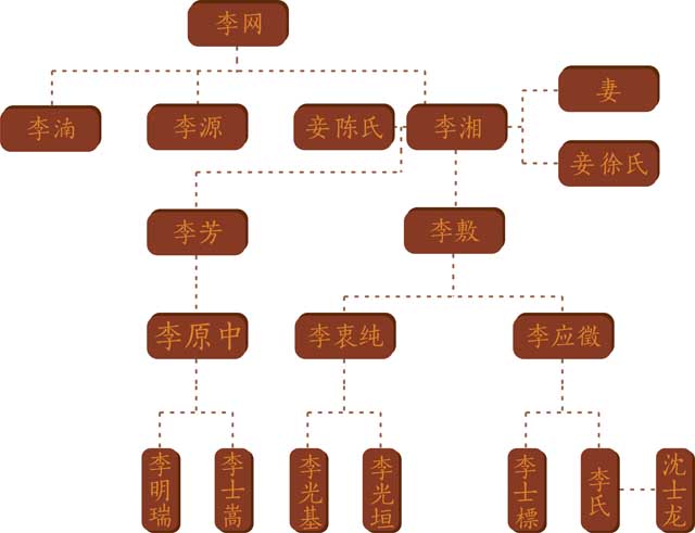 李湘一族屬梅溪李氏,在當?shù)貫橥?。李湘的祖上自元朝末年從江蘇江陰遷至梅里一帶。李湘生于明成化二十三年(1487年),字本澄,號東泉,一生未有功名,也未做官,但其子李芳、其孫李衷宏(又名李原中)均中進士。李湘死后“賴子芳貴”,也就是父憑子貴,被追封為文林郎。文林郎為正七品,是古代有官名而無職事的官稱。