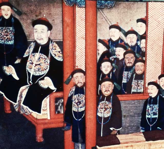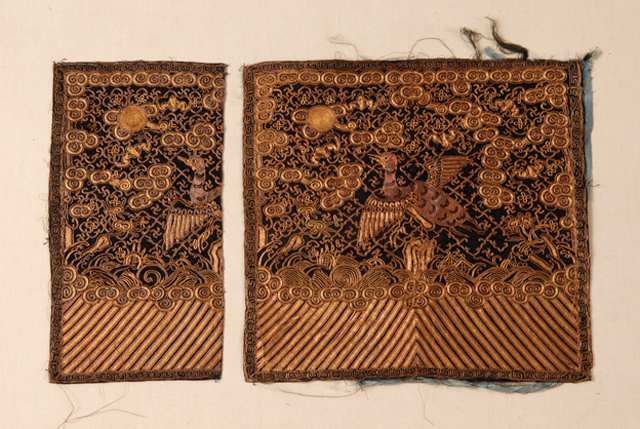 清代補子沿用明代舊制,但因補服變?yōu)閳A領(lǐng)對襟的款式,因此前胸的補子分為兩片,后背仍是完整一塊。相對于明代的補子,清代的補子尺寸略小,各品級官員的動物也略有區(qū)別。