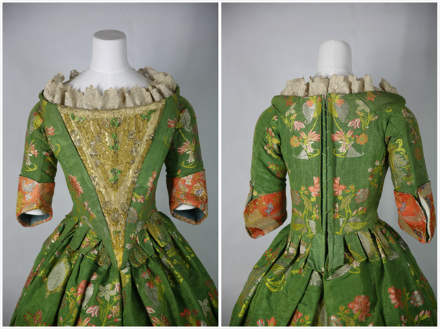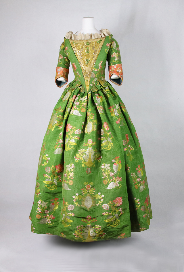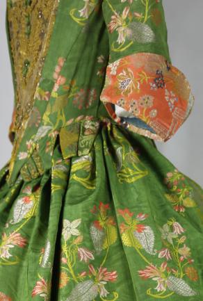 這件17世紀(jì)末期的禮服裙使用了在當(dāng)時非常珍貴的織錦緞面料縫制而成,綠色地上巴洛克風(fēng)格彩色大花卉圖案對稱分布,充分顯示了擁有者對財富和社會地位的炫耀。巴洛克時期面料通常在每個循環(huán)圖案中央有一個大花紋圖案,兩側(cè)對稱分布小的花卉紋樣。[1]