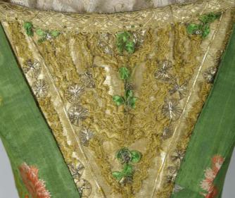 緊身上衣用近三十根鯨骨支撐,后背用絲帶閉合,鯨骨均勻插入并直至下擺的垂片,前面的三角胸衣裝飾精美,特別引人注目。在銀絲地上用綠色的絲線和銀線精心繡出圓形紋樣,金屬線蕾絲呈三角環(huán)狀層層點(diǎn)綴。