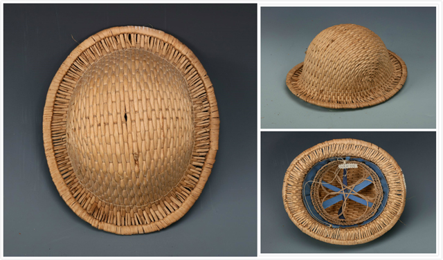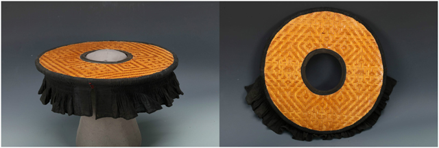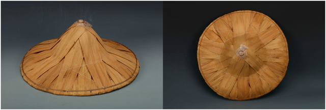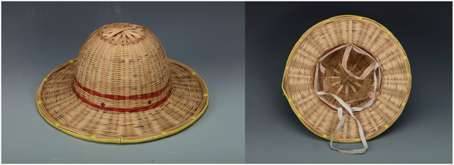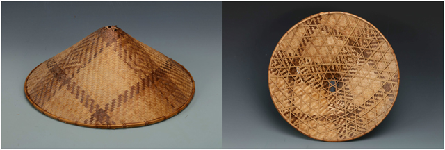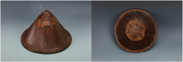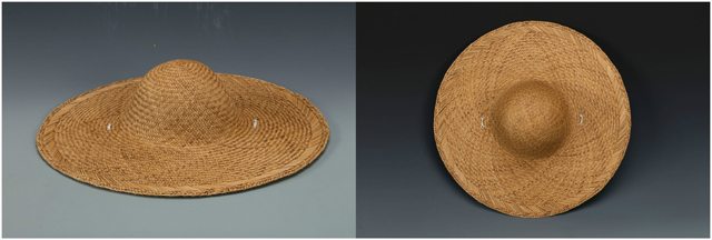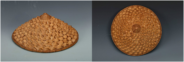 這頂花式樁縷編帽子是樁縷編技法的一種變體。使用的竹縷較寬,在編織時(shí)無(wú)法順利地形成一個(gè)平整的圓形帽架。為了克服這問(wèn)題,兩根竹縷相互扭轉(zhuǎn),形成不尋常的紋理,同時(shí)也編順了帽子的圓形。