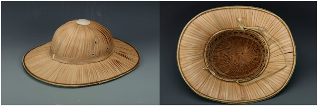 亞洲帽子,其骨架基本都是圓形的。在18世紀(jì)中期,我們看到了西方帽子對(duì)亞洲帽子的影響:因?yàn)闅W洲人的頭骨更偏細(xì)長(zhǎng),所以他們?cè)O(shè)計(jì)的帽子骨架大多是基于橢圓形。這種形狀的帽子很快在許多地區(qū)流行起來(lái),逐漸成為政府雇員和平民日常使用的生活品。這款棕櫚葉防暑帽可以用不同的材料和技法制成,材料上從植物到成型塑料都有。
