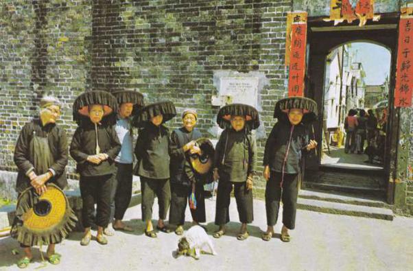 自1950年代以來(lái),客家帽成為香港新界鄉(xiāng)村生活的標(biāo)記。帽子中間有一個(gè)孔可貼合頭部,邊緣周?chē)泻谏蝰薜拿薏?,可抵擋?yáng)光。客家婦女以勤勞聞名,婦女過(guò)去通常編織帶圖案的花帶來(lái)裝飾自己的帽子,還可以以此識(shí)別穿戴者?;◣系膱D案具有吉祥的含義,如這種帶有“麻籽”的圖案象征著“多子”的期盼與祝愿。
