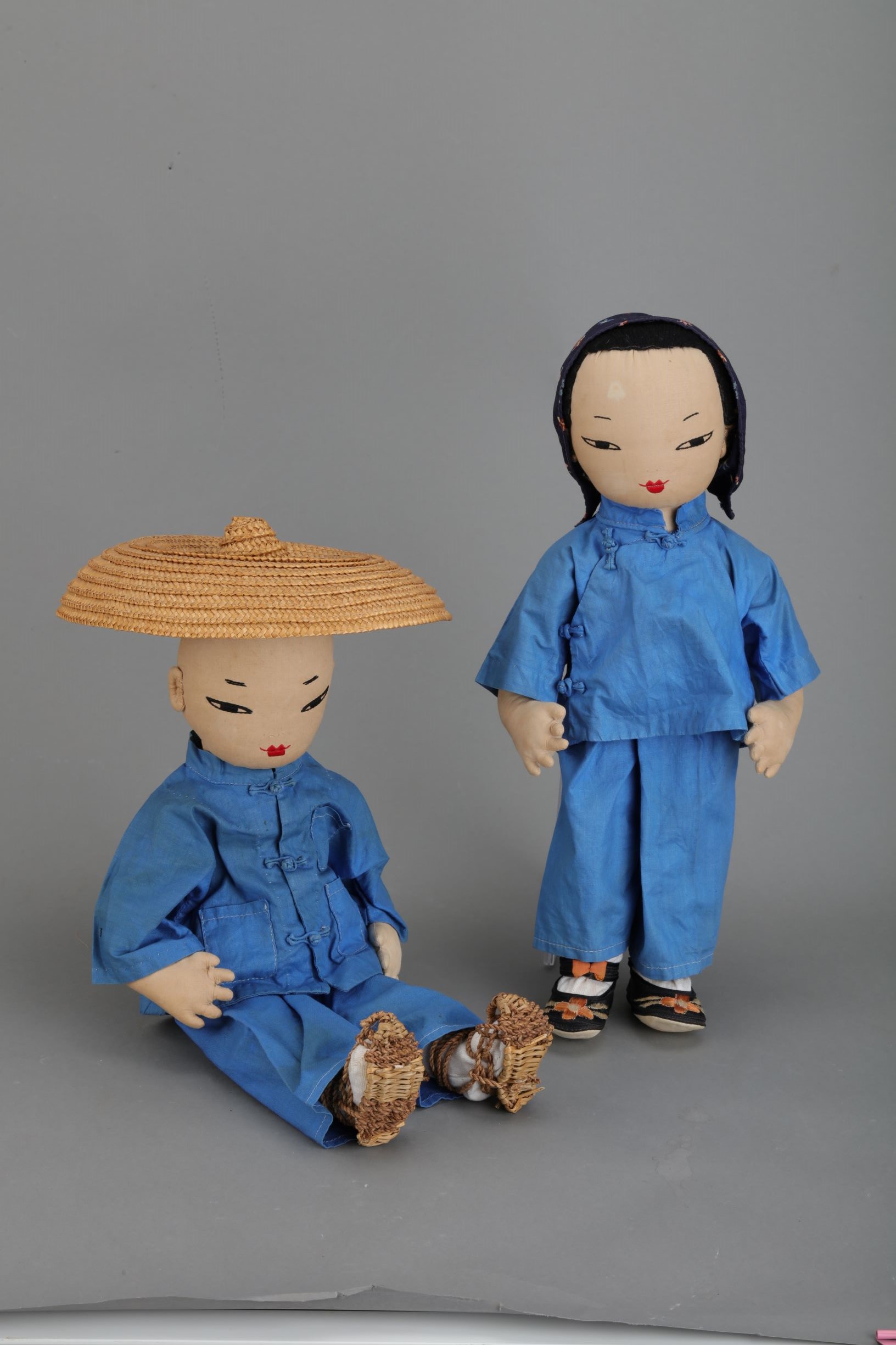 20世紀(jì)50年代的娃娃,展示一對(duì)穿著傳統(tǒng)服裝,戴著機(jī)編草帽的農(nóng)民夫婦。