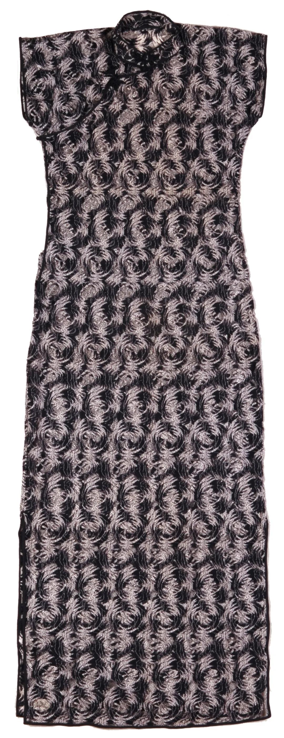 中國絲綢博物館藏的這件黑地渦紋蕾絲旗袍為20世紀(jì)30-40年代生產(chǎn),通體采用輕薄的蕾絲面料,穿搭時需襯裙打底。在黑色網(wǎng)格狀底上織出黑白相間的渦紋,繁密有序,遍布旗袍的每個部位,兼具時尚又不失旗袍的華美典雅之感。