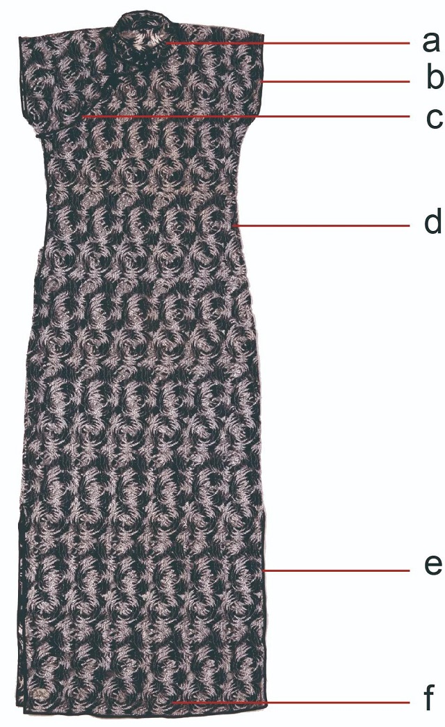 首先分析這件黑地渦紋蕾絲旗袍的形制特點。用字母編號具體為,a立領(lǐng),b袖口,c斜襟,d腰身,收腰明顯,可凸顯女性身姿,e側(cè)邊開叉處,f下擺。在領(lǐng)口、襟緣、袖口、開叉處及下擺處均鑲有黑色細(xì)滾邊,防止旗袍磨損的同時也起到了很好的裝飾作用。