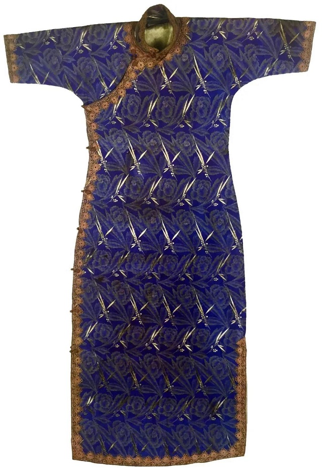 民國紫色織錦緞鑲蕾絲邊短袖旗袍(中國絲綢博物館藏)