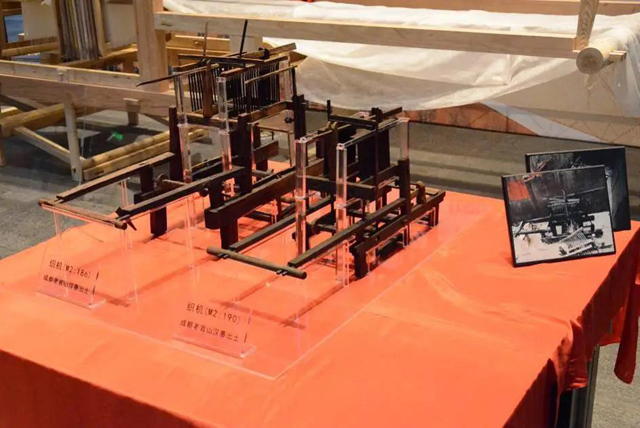 結(jié)合文獻(xiàn)資料與相關(guān)文物數(shù)據(jù),通過(guò)逐個(gè)部件的解讀和研究論證,已經(jīng)基本掌握四臺(tái)織機(jī)的機(jī)械構(gòu)造和織造原理,進(jìn)而展開(kāi)了織機(jī)模型(圖23)的復(fù)制工作,中國(guó)絲綢博物館現(xiàn)已制作了老官山漢墓整個(gè)織造工坊的模型(圖24)。