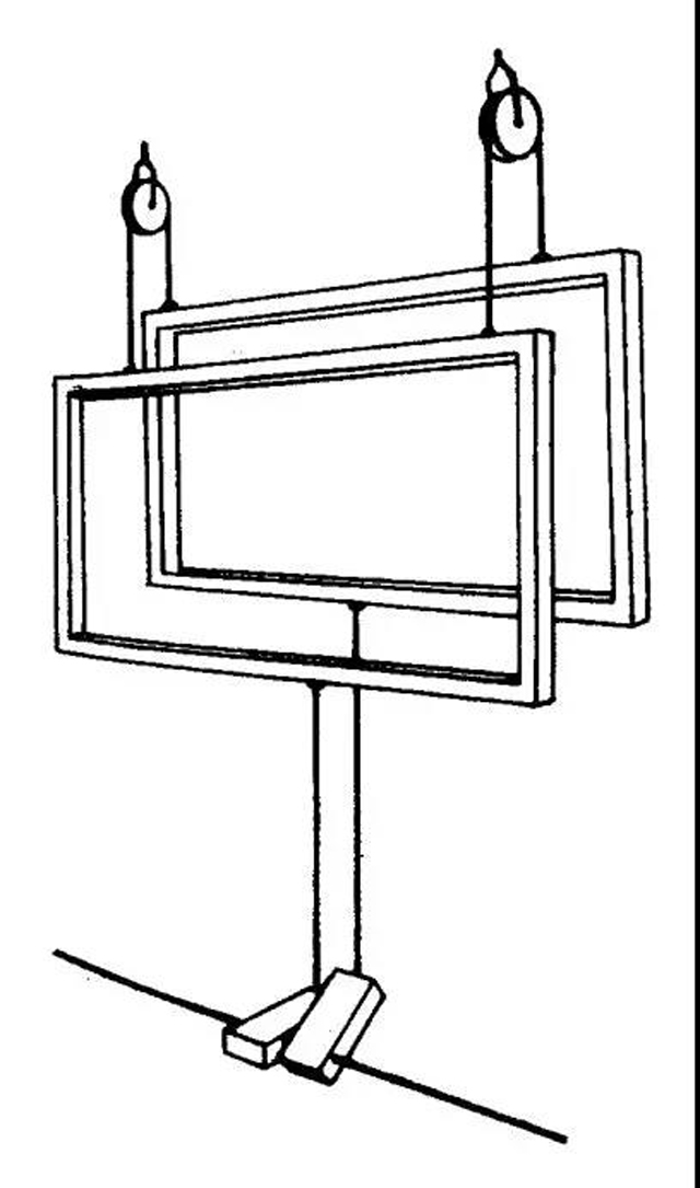 在出土的四臺(tái)模型中,最大的一臺(tái)(編號(hào)186)是滑框式多綜織機(jī)(見(jiàn)圖19),它的動(dòng)作原理[3]如下(見(jiàn)圖20)。