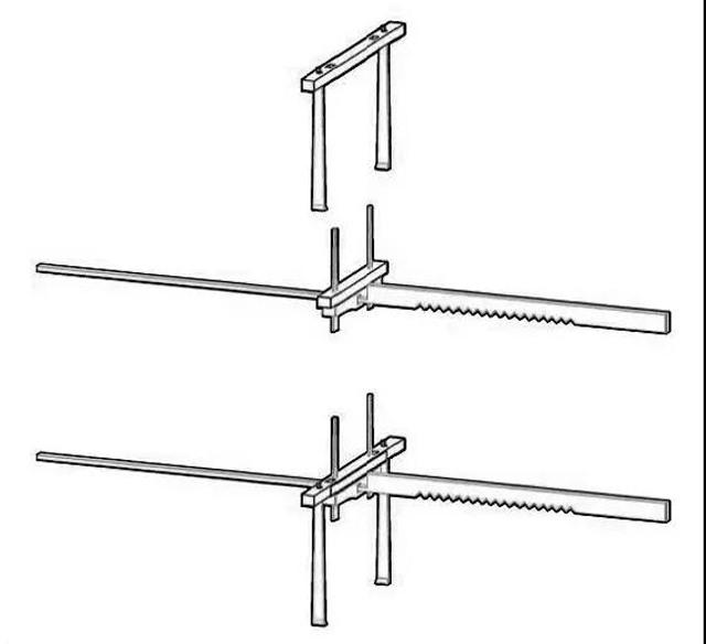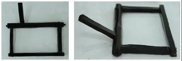 滑框式一勾多綜提花織機(jī)的綜片是靠一對(duì)勾子提升,這對(duì)勾子固定在一根圓木上,圓木上左右開(kāi)兩孔,從孔中穿過(guò)一對(duì)引導(dǎo)雙勾(圖16)做上下垂直運(yùn)動(dòng)的木片,暫命名為雙叉,主要起導(dǎo)向和定位的作用。