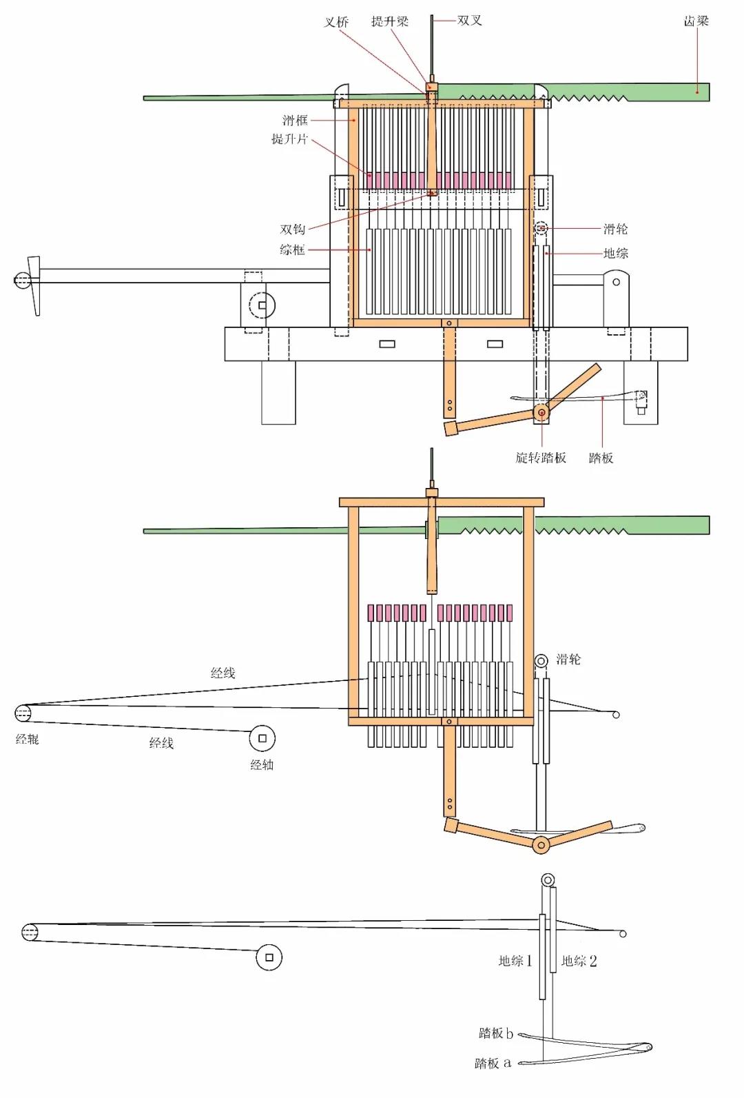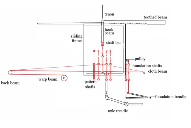 織機(jī)的操作以經(jīng)緯線為主,經(jīng)線布于機(jī)上,緯線由梭引織入,通過(guò)經(jīng)緯交織形成織物。提花織機(jī)需要根據(jù)紋樣規(guī)律準(zhǔn)確的將對(duì)應(yīng)的經(jīng)線提起后,織入相應(yīng)的緯線,才能形成提花織物。老官山織機(jī)上最為復(fù)雜的系統(tǒng)就是提花綜片,它是利用多個(gè)綜片將紋樣信息儲(chǔ)存再釋放的裝置,是形成提花織物的主要部件。根據(jù)它們的織造原理和機(jī)械傳動(dòng)方式,這四臺(tái)提花織機(jī)總體可稱為一勾多綜提花機(jī),前者可稱為滑框式一勾多綜提花機(jī),后者可以稱為連桿式一勾多綜提花機(jī)。